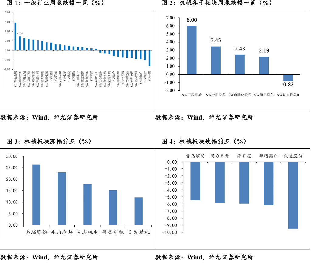 上周(2025.12.01-2025.12.05)机械设备行业上涨2.9%,在一级31个 行业中排名第2位。子行业中,工程机械(+6%)、专用设备(+3.45%)、 自动化设备(+2.43%)、通用设备(+2.19%)、轨交设备(-0.82%)。 重点覆盖个股中,涨幅前五的公司分别为杰瑞股份(+26.4%)、冰山 冷热(+22.93%)、昊志机电(+17.85%)、耐普矿机(+15.19%)、日发 精机(+12.01%),主要与燃气轮机、冰雪经济及机器人相关;跌幅前五 的公司分别为凯迪股份(-9.51%)、华曙高科(-6.14%)、海目星(-5.96%)、同力日升(-5.86%)、青鸟消防(-5.45%)。