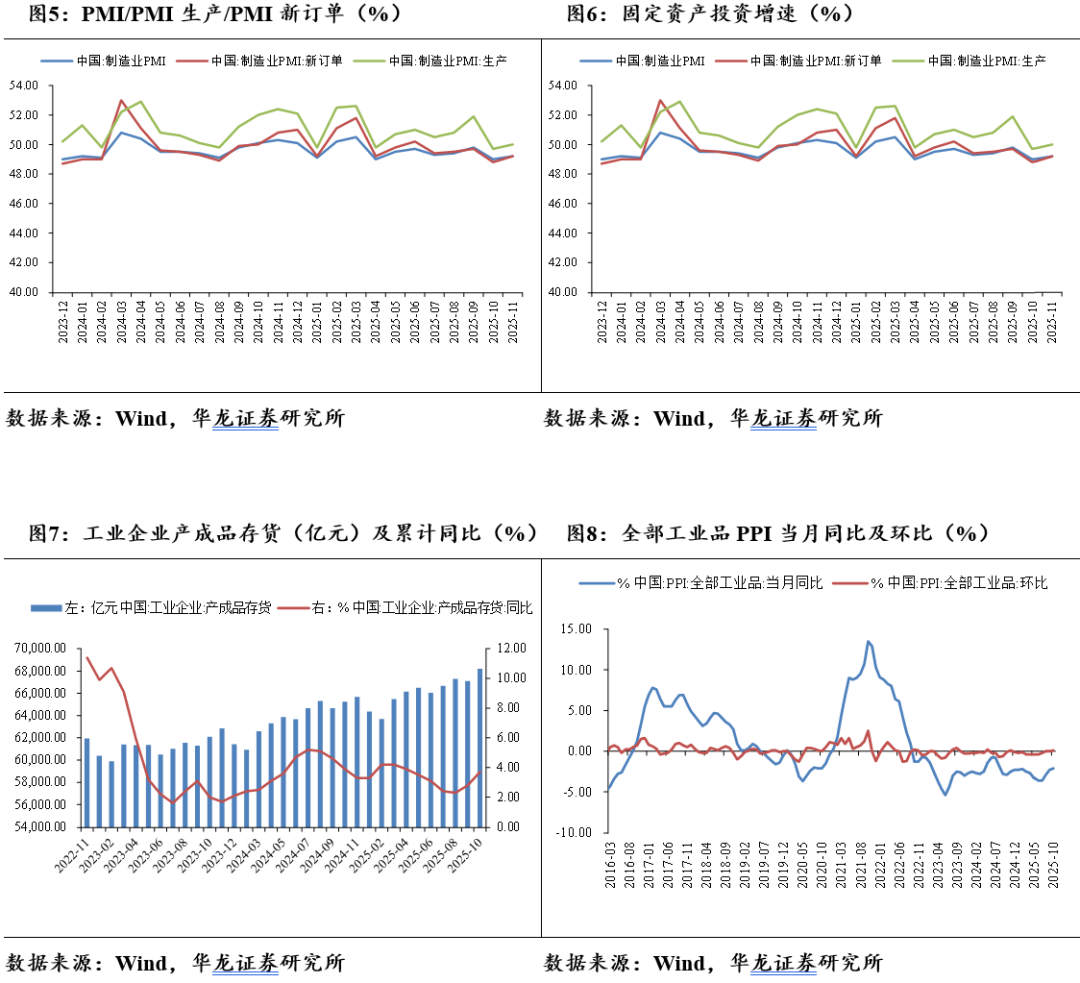 截至2025年11月,我国制造业PMI 49.2%,同比-1.1pct,环比+0.2 pct;制造业新订单PMI 49.2%,同比-1.6pct,环比+0.4pct;制造业生产PMI50%,同比-2.4pct,环比+0.3pct。
