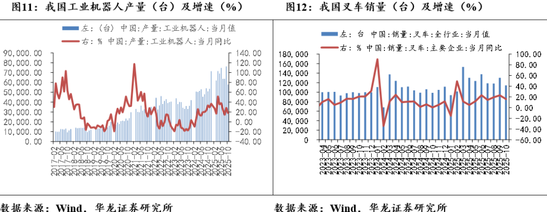 2025年10月,我国工业机器人产量57858台,同比增加17.9%;2025年10月,我国叉车销量114250台,同比增加15.89%。