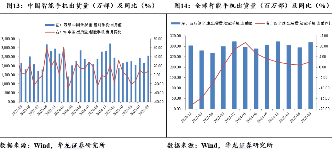 2025年9月,我国智能手机出货量2561.7万部,同比增长8%;2025年第三季度全球智能手机出货319.3百万部,同比增加2.6%,增速连续九个季度同比正增长,智能手机出货量复苏明显。