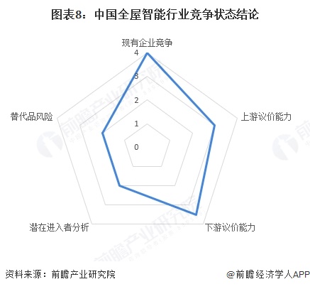 根据以上分析,对各方面的竞争情况进行量化,5代表最大,0代表最小,全屋智能行业的竞争情况如下图所示: