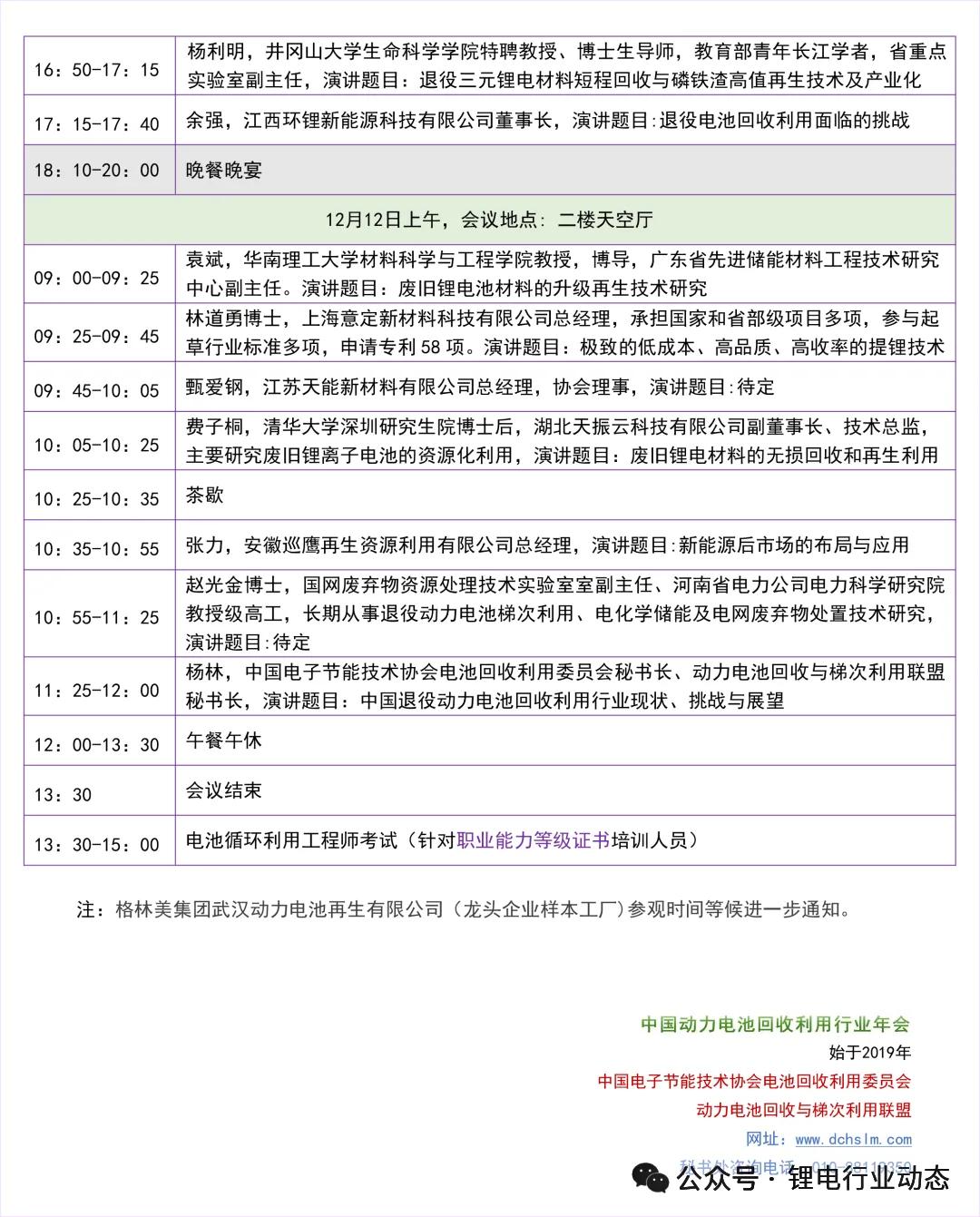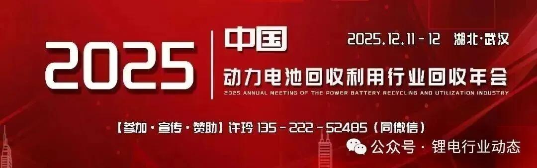 由中国电子节能技术协会电池回收利用专业委员会、格林美集团(武汉动力再生)、动力电池回收网主办,“2025中国动力电池回收利用行业回收年会”。武汉瑞科美新能源有限责任公司、山东动力电池回收利用协会、江西省动力电池回收利用协会协办,动力电池回收与梯次利用联盟大力支持的“2025中国动力电池回收利用行业回收年会”将于2025年12月11-12日在武汉召开。参观格林美武汉动力电池回收工厂(名额40人)。参会联系人:许玲13522252485(同微信)