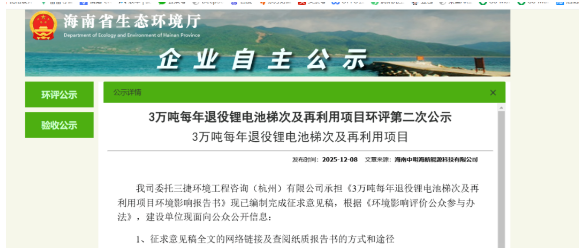 近日,海南中明海新能源科技有限公司正式对外发布《3 万吨每年退役锂电池梯次及再利用项目》环境影响评价第二次公示,标志着海南省在新能源产业绿色循环发展领域落下关键一子。该项目委托三捷环境工程咨询(杭州)有限公司编制的环境影响报告书征求意见稿已完成,根据《环境影响评价公众参与办法》要求,建设单位面向社会公开项目核心信息,主动接受公众监督,彰显了企业在推动绿色发展中的责任与担当。