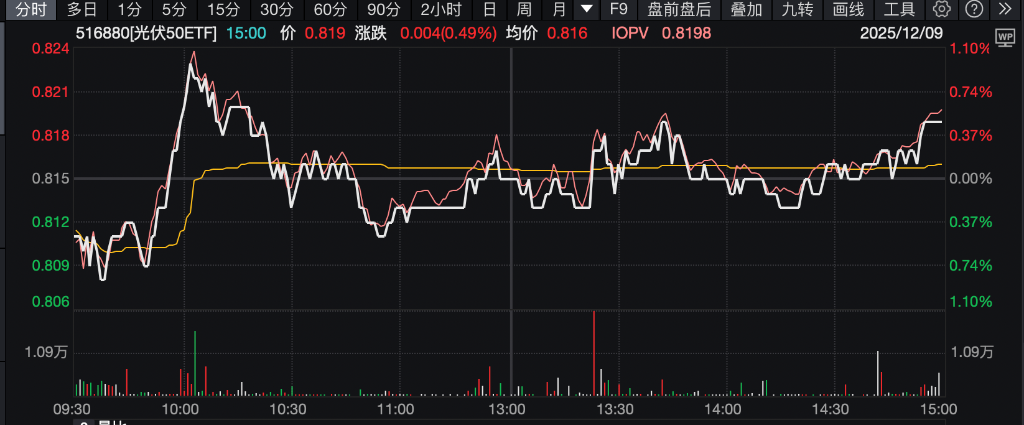截止12月9日收盘,光伏50ETF上涨0.49%。个股层面,龙头股通威股份盘中由跌转升,自跌幅2%附近直线拉涨,最高涨幅突破3%;清源股份直线涨停,拓日新能收涨近5%,大全能源涨6%。