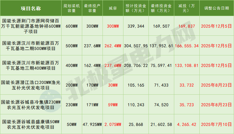 2025年下半年,国家能源集团旗下上市公司长源电力接连发布6条光伏项目调整公告,其核心数据触目惊心:原规划总装机1980MW,最终核定投产容量1089MW,规模“腰斩”近45%;对应总投资规划109.4亿元,最终投资额55.1亿元,投资紧急“刹车”54.3亿元。