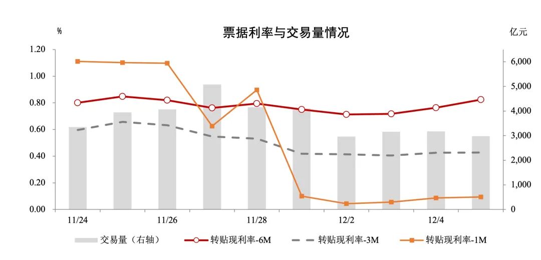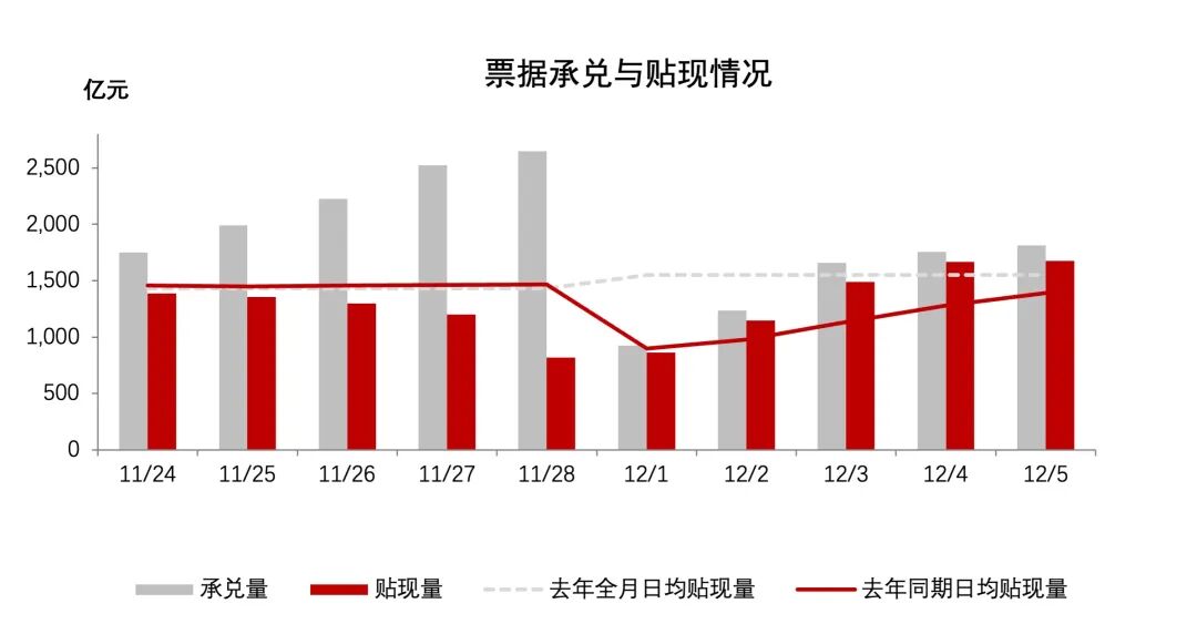 一级市场方面,本周日均承兑1476.91亿元,较上周环比减少33.68%;本周日均贴现1368.37亿元,较上周环比增加13.00%;承贴比92.65%,较上周环比增加38.27个百分点。12月票据市场到期量约2.90万亿元,后续填补到期需日均贴现约1231.44亿元。