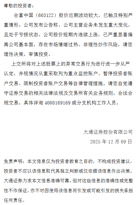 【风险提示】关于合富中国(603122)交易风险提示公告