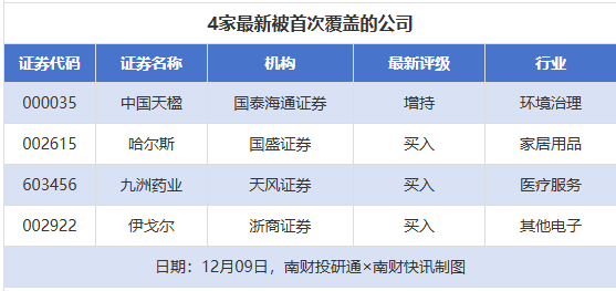 首次覆盖方面,12月9日券商共给出了4次首次覆盖。其中,中国天楹获得国泰海通证券给予“增持”评级,哈尔斯获得国盛证券给予“买入”评级,九洲药业获得天风证券(维权)给予“买入”评级,伊戈尔获得浙商证券给予“买入”评级。