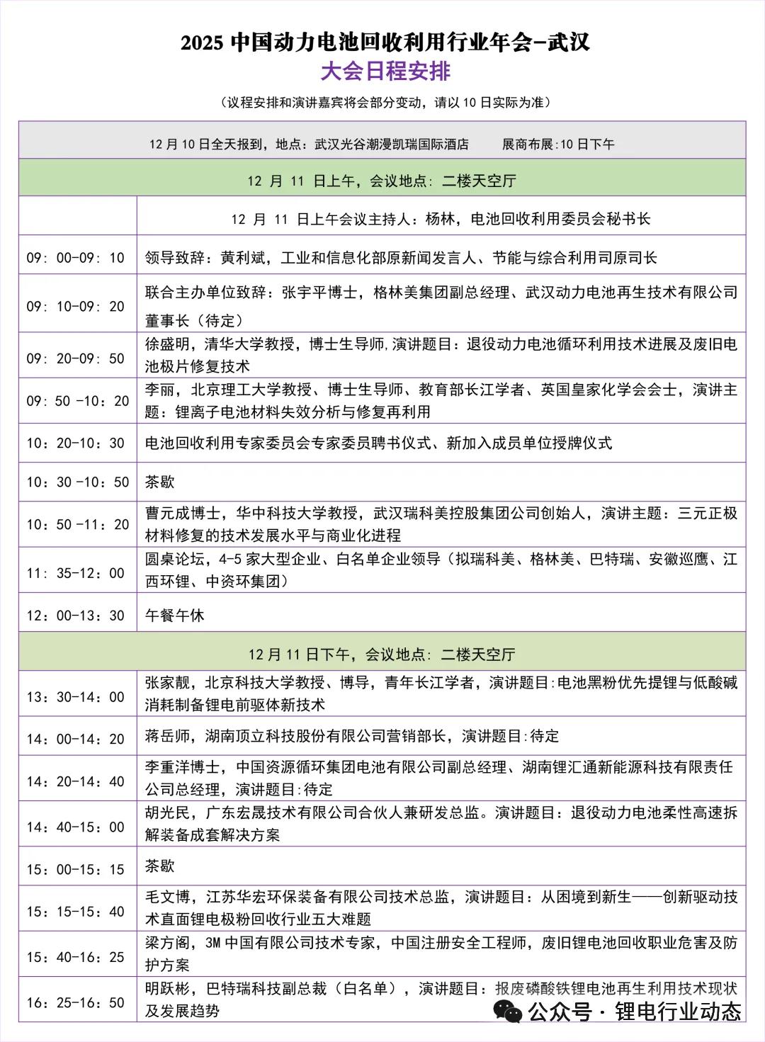 由中国电子节能技术协会电池回收利用专业委员会、格林美集团(武汉动力再生)、动力电池回收网主办,“2025中国动力电池回收利用行业回收年会”。武汉瑞科美新能源有限责任公司、山东动力电池回收利用协会、江西省动力电池回收利用协会协办,动力电池回收与梯次利用联盟大力支持的“2025中国动力电池回收利用行业回收年会”将于2025年12月11-12日在武汉召开。参观格林美武汉动力电池回收工厂(名额40人)。参会联系人:许玲13522252485(同微信)