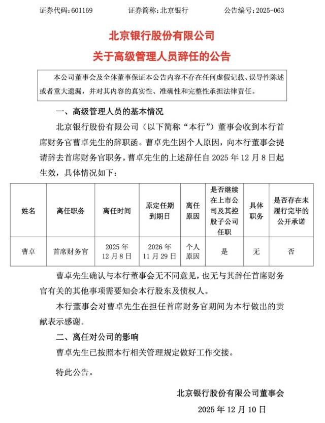 12月10日,北京银行发布公告称,该行董事会收到首席财务官曹卓的辞职函。曹卓因个人原因,向该行董事会提请辞去首席财务官职务,上述辞任自 2025年12月8日起生效。