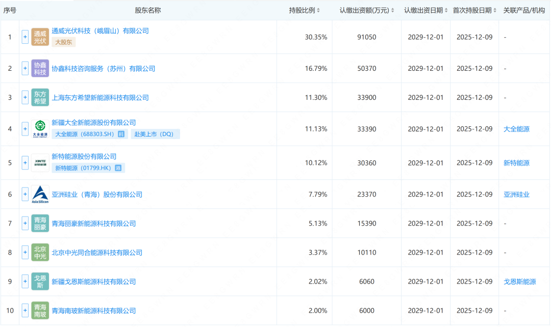 公司由9家硅料企业通威、协鑫、东方希望、大全、新特、亚洲硅业、丽豪、戈恩斯、南玻,以及光伏行业协会100%控股的中光同合共同出资成立。公司的股权结构如下图所示。