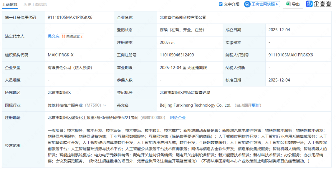 除此之外,企查查显示,同一工商注册地址的还有一家公司——北京富仁新能科技有限公司公开信息显示,富仁集团是一家江阴企业,主要从事智能制造、绿色电力、智慧能源、工业物联等业务。
