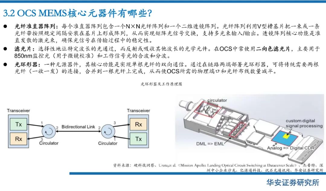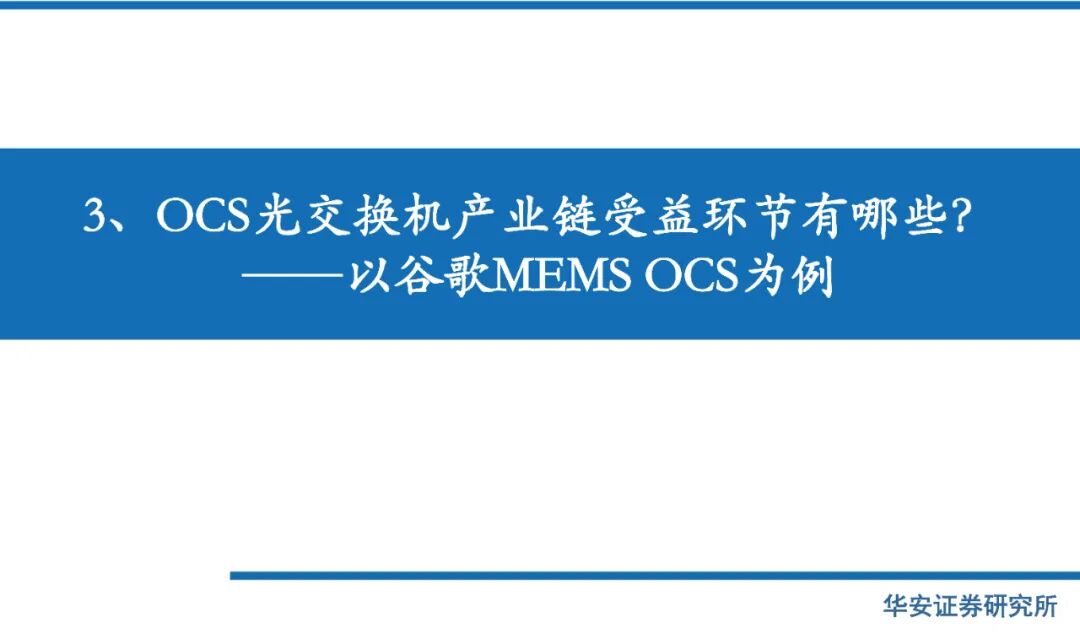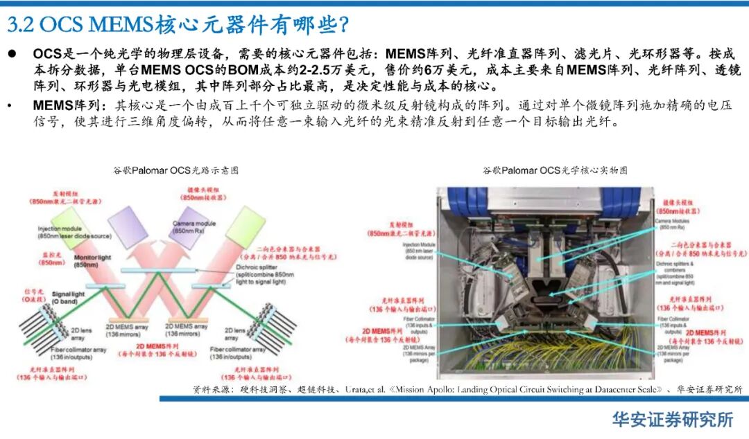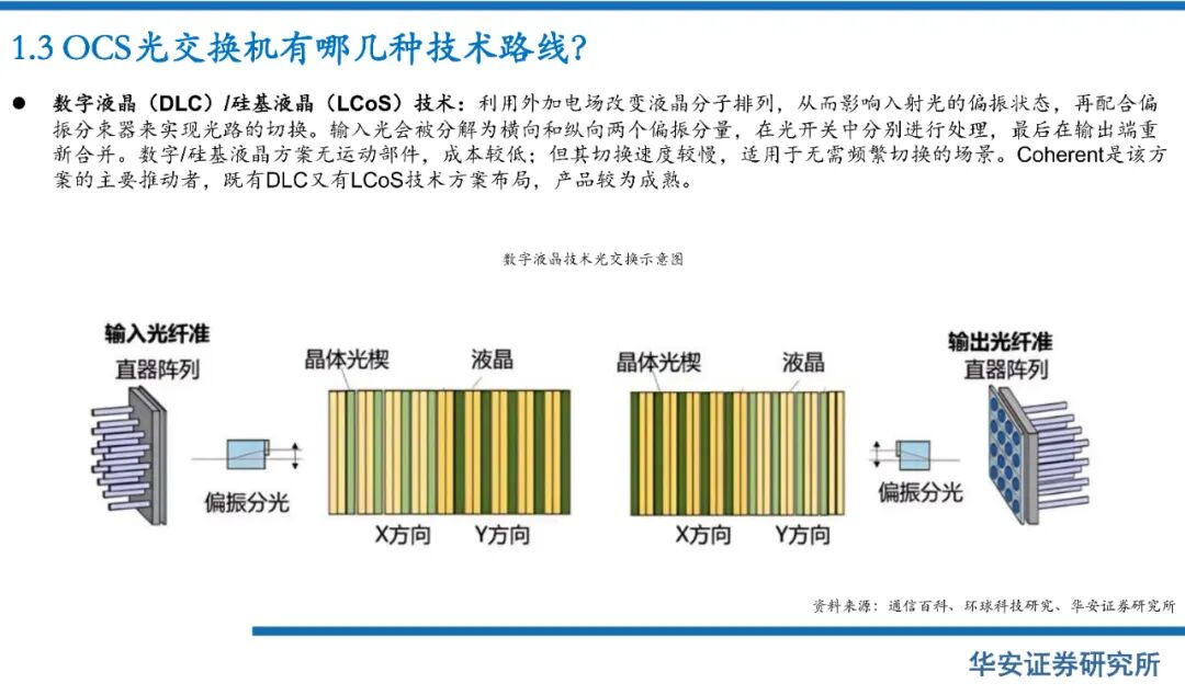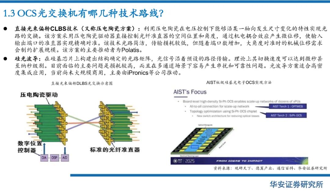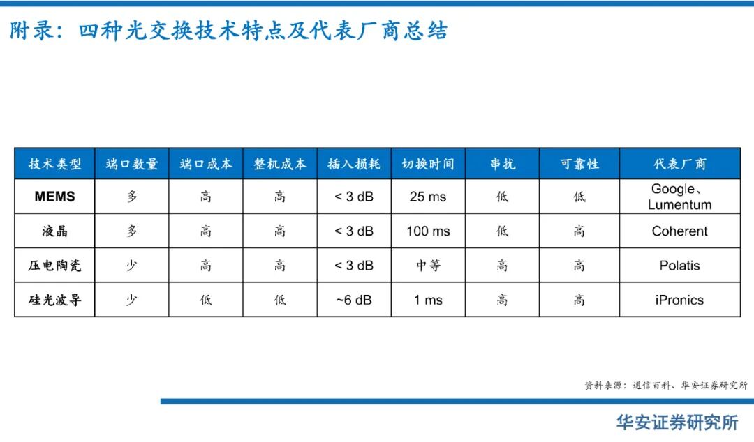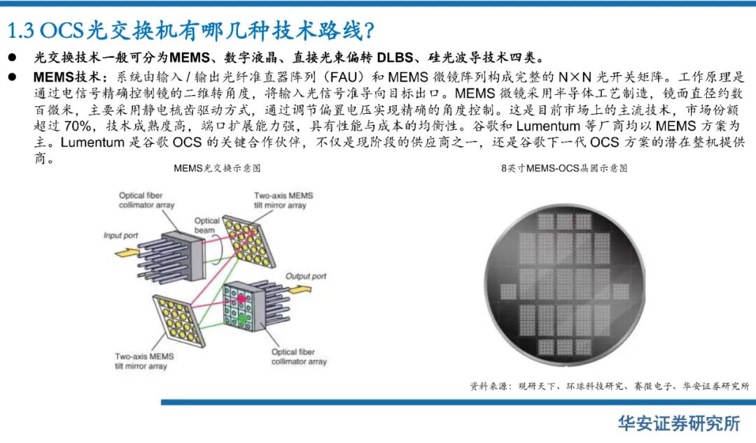 当前OCS主流技术路线有四类:占市场 70% 份额的 MEMS 微镜方案,靠半导体工艺控制微镜偏转,兼顾性能与成本,谷歌、Lumentum 是主要推动者;数字液晶方案无运动部件但切换慢,适合静态场景;压电陶瓷方案传输损耗低,却难扩展多端口;硅光波导切换快,却面临损耗与串扰难题,暂未大规模商用。