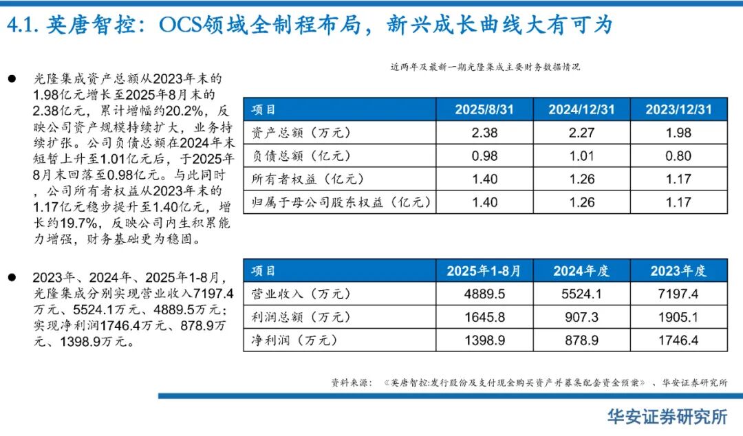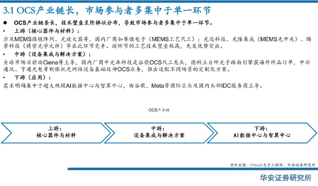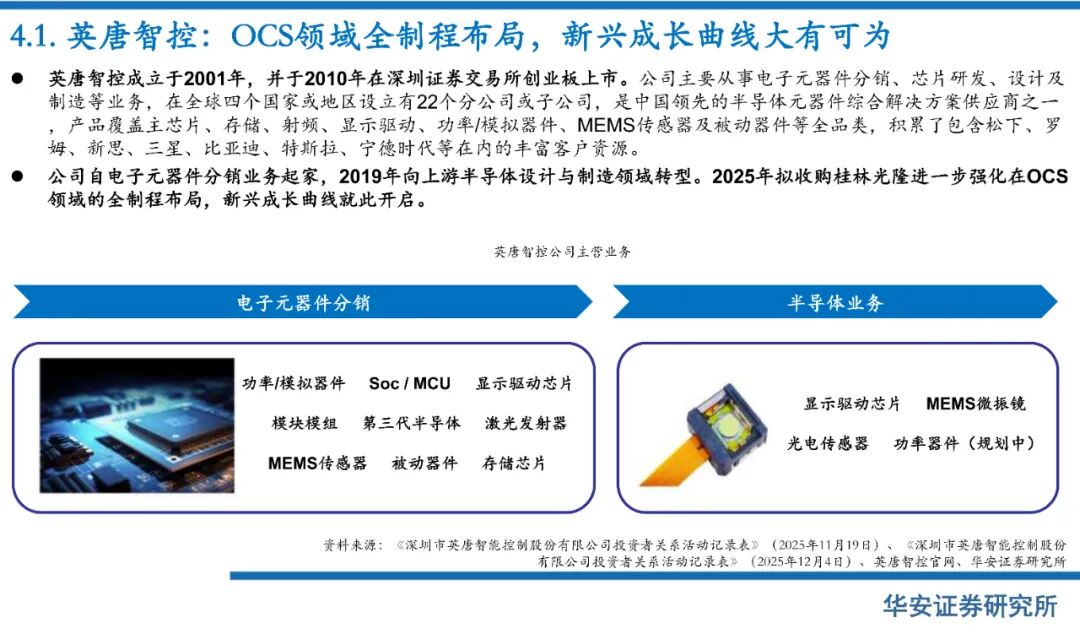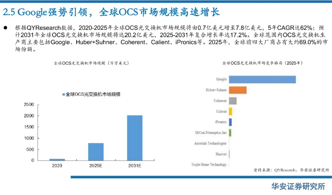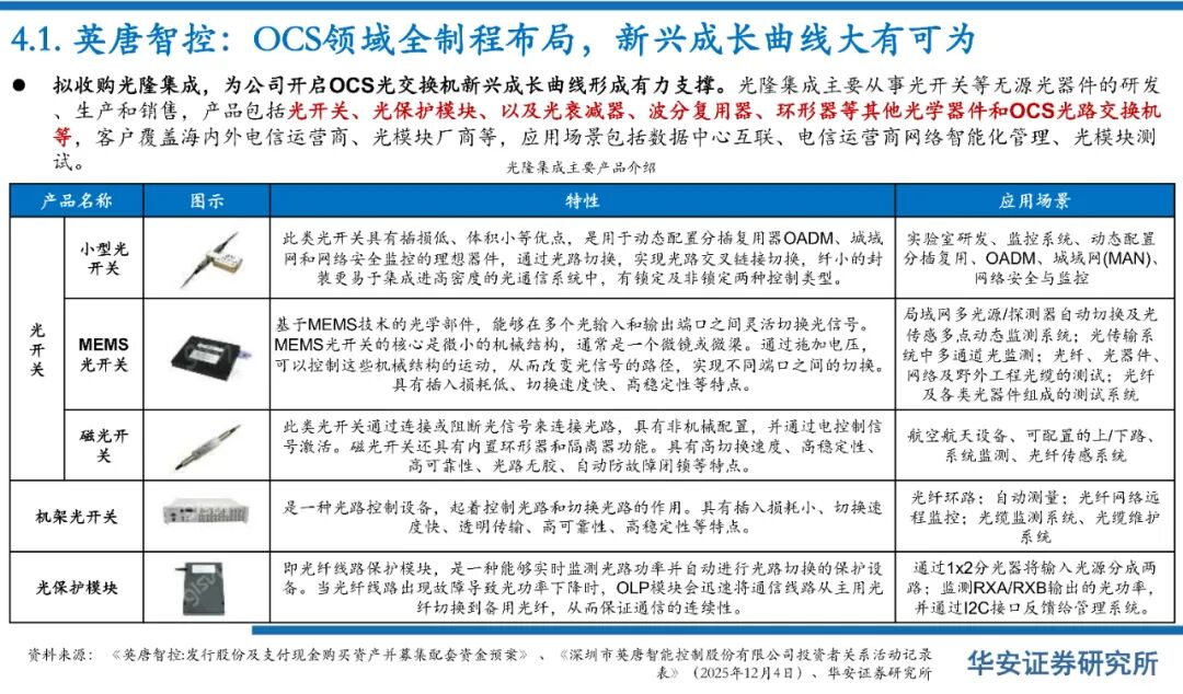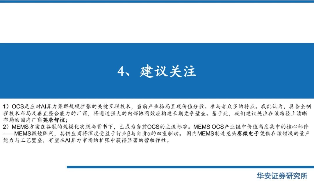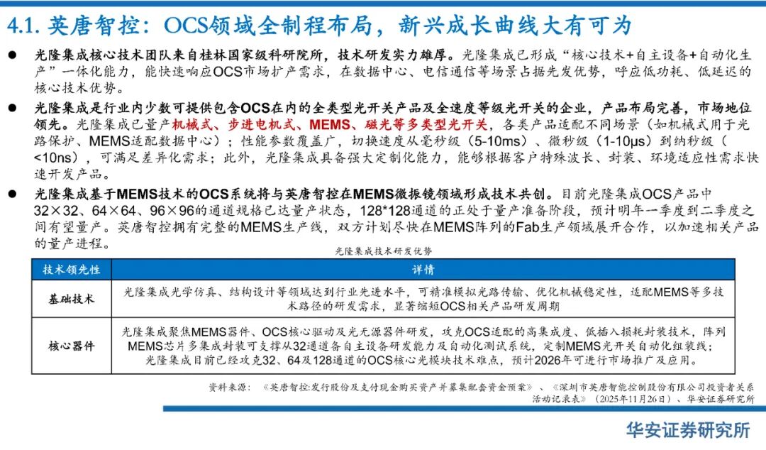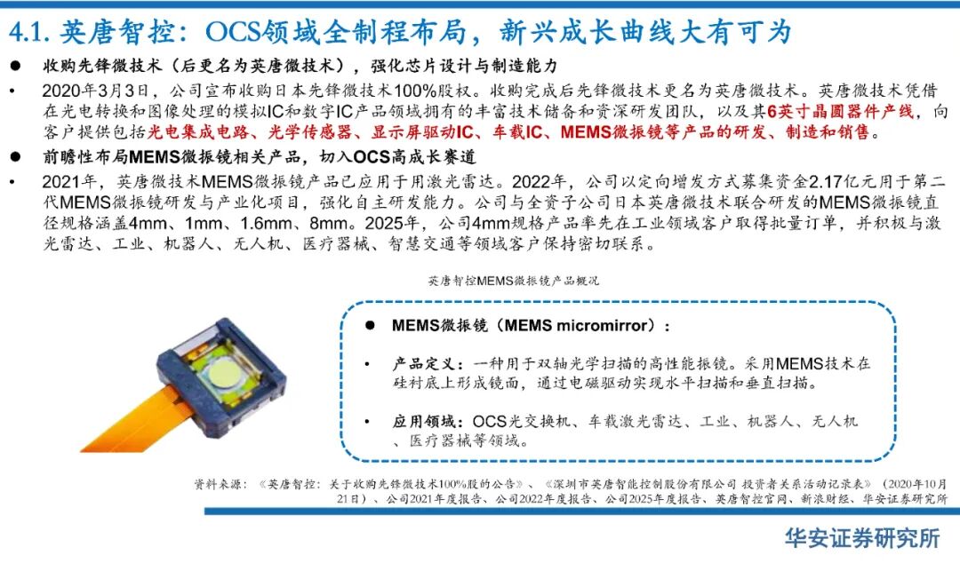 从产业看,OCS 市场正高速增长。全球规模将从 2020 年 0.7 亿美元增至 2025 年 7.8 亿美元,年复合增长率 62%,2031 年预计达 20.2 亿美元。不过市场集中度高,2025年前四大厂商占 69% 份额,谷歌、Coherent 等领跑。国内企业也在加速追赶:英唐智控通过收购光隆集成,整合 MEMS 微振镜与 OCS 系统技术,打造全制程能力;赛微电子作为 MEMS 代工龙头,2023 年已实现 MEMS-OCS 量产,北京产线正推进小批量试产。