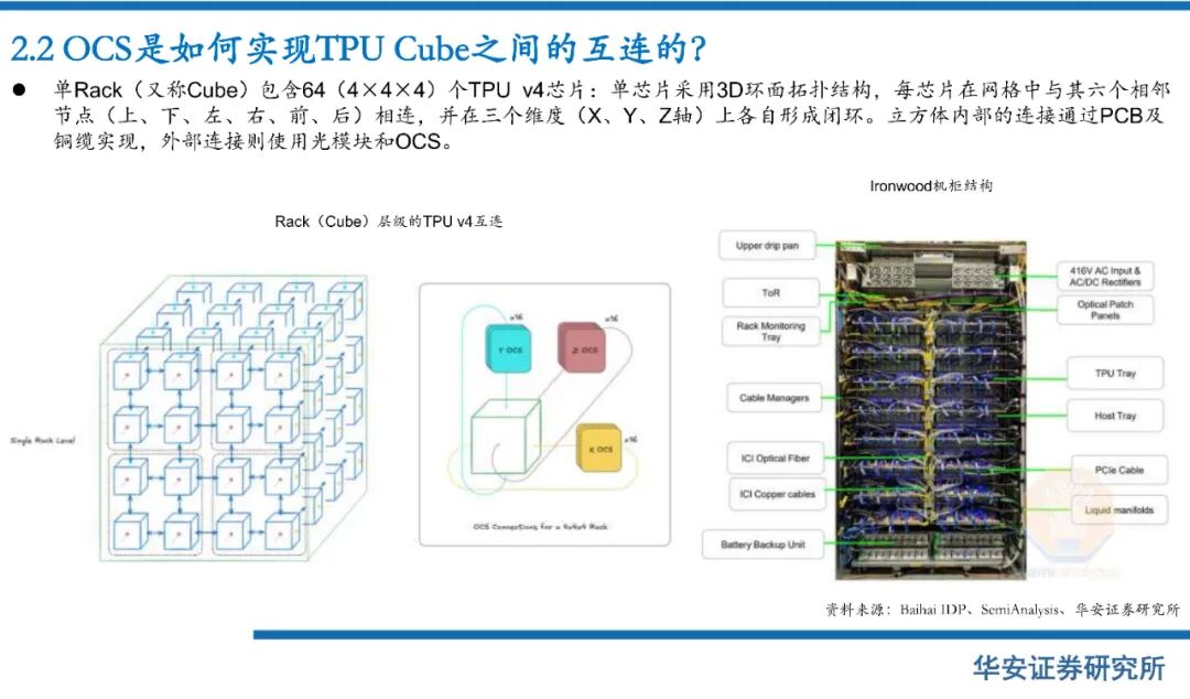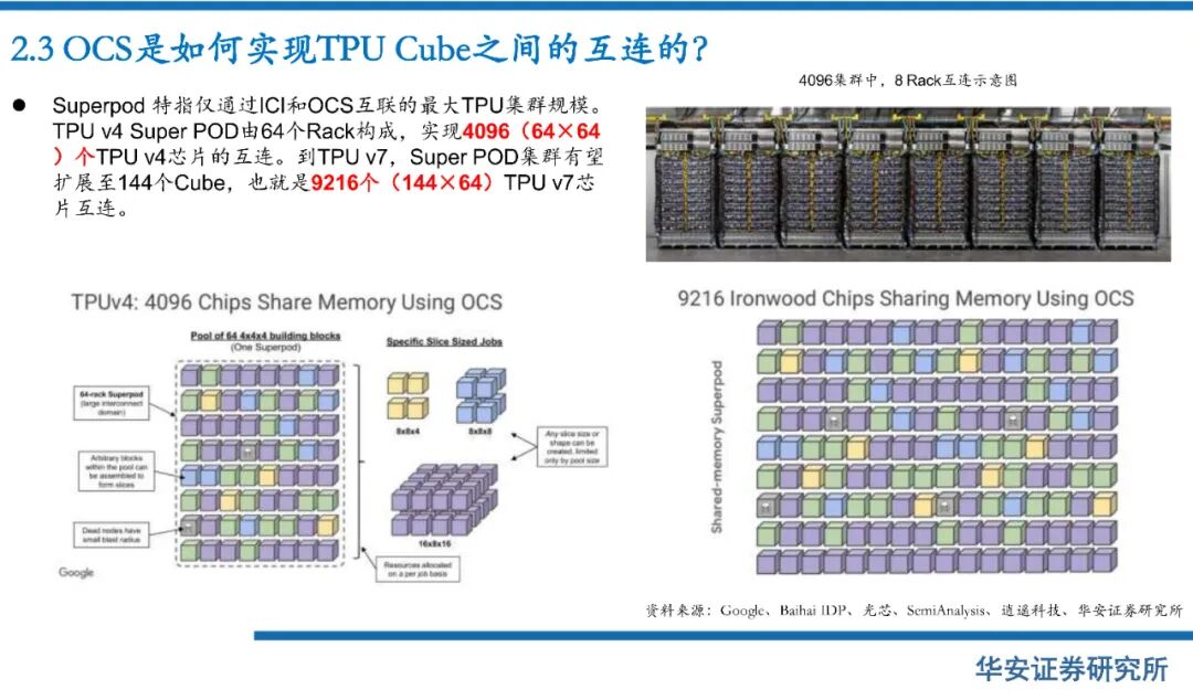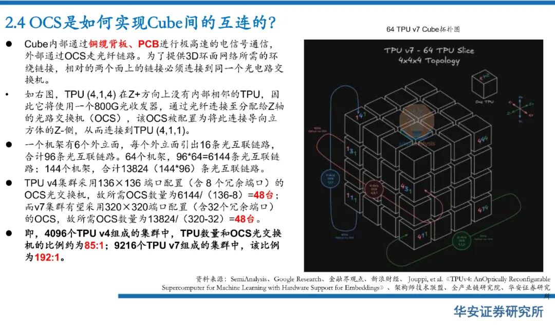 以谷歌集群为例,4096 个 TPU v4 芯片仅需 48 台 136 端口 OCS,TPU 与 OCS 比例达 85:1;未来升级到 9216 个 TPU v7 芯片,因采用 320 端口高密度 OCS,仍只需 48 台,比例提升至 192:1,扩展性优势凸显。
