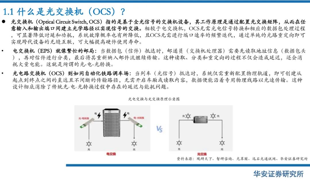 OCS 光交换机,即光电路交换机,通过配置光交换矩阵建立直达光学路径,无需像电交换机那样反复进行 “光、电、光” 转换。打个比方,电交换机像繁忙邮局,需拆封信件(读取数据包)再分类投递;而 OCS 如同自动化铁路调车场,直接切换轨道(光路),让数据以光速直达目的地。这一特性使其延迟、功耗显著降低,还能实现跨代设备无缝互联,延长硬件使用寿命。