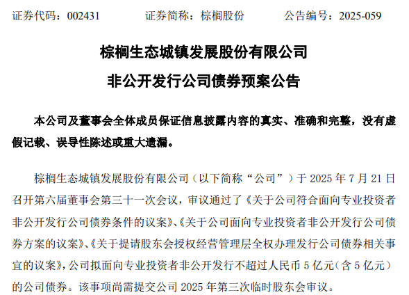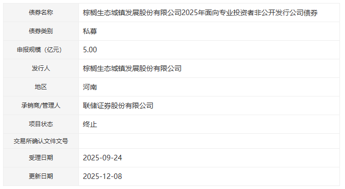 12月9日,深交所披露信息显示,河南A股上市公司棕榈股份(002431.SZ)拟发行的5亿元私募公司债券项目状态更新为“终止”。