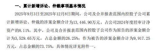 与此同时,公司亦需面对诉讼风险的冲击,2025年9月至12月,公司及控股子公司新增诉讼、仲裁涉案金额近1.34亿元,占公司2024年度经审计净资产的8.11%。