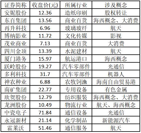 涨停板个股中,股价创出近一年新高的个股有16只(不包括创出历史新高的个股),包括安妮股份、东百集团、再升科技、博纳影业、茂业商业、四川金顶、厦门港务、跃岭股份、多利科技、神农种业、南矿集团、欣贺股份、龙洲股份、中瓷电子、永冠新材、霍莱沃,具体如下表所示。