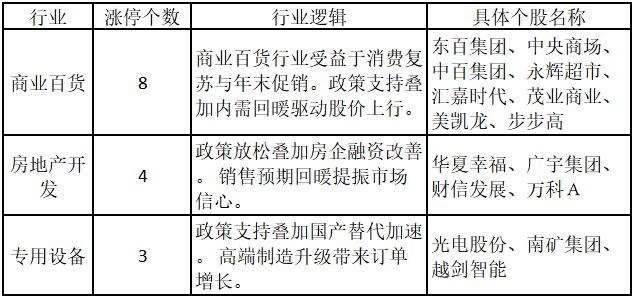 从行业特征来看,今日涨停板个股中,商业百货、房地产开发、专用设备行业的个股最多。