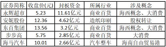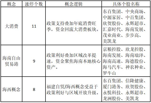 从概念特征来看,今日涨停板个股中,大消费、海南自由贸易港、海西概念的个股最多。