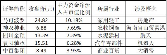 主力资金净流入金额占市值比例排名前5的个股分别为马可波罗、神农种业、四川金顶、襄阳轴承、中百集团(维权)。