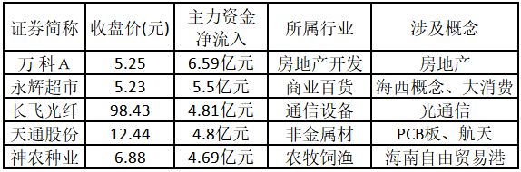 从主力资金来看,今日涨停板个股中,主力资金净流入金额排名前5的个股分别为万科A、永辉超市、长飞光纤、天通股份、神农种业。