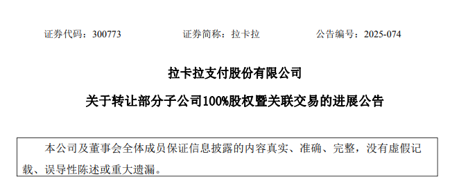 日前,拉卡拉发布了“关于转让部分子公司100%股权暨关联交易的进展公告”。