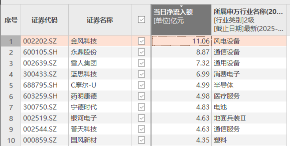 上证报中国证券网讯(记者 徐蔚)Choice数据显示,12月11日,资金净流入额排名前十的个股依次是金风科技、永鼎股份、雪人集团、蓝思科技、C摩尔-U、药明康德、宁德时代、银河电子、普天科技、国风新材。其中,金风科技当日资金净流入额为11.06亿元。