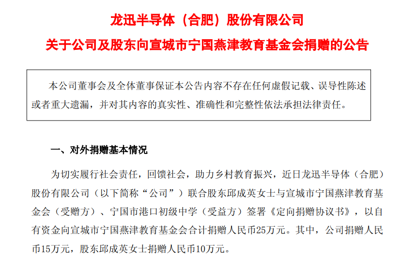 12月11日,龙迅股份(688486.SH)公告,公司联合股东邱成英女士与宣城市宁国燕津教育基金会(受赠方)、宁国市港口初级中学(受益方)签署《定向捐赠协议书》,以自有资金向宣城市宁国燕津教育基金会合计捐赠25万元。其中,公司捐赠15万元,股东邱成英女士捐赠10万元。