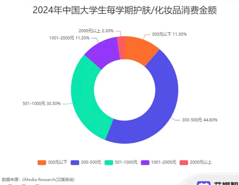 另据艾媒咨询数据,在2024年中国大学生每学期护肤/化妆品消费金额中,有近九成的消费者会投入300元以上的预算。这意味着学生群体是一个极具潜力的消费市场。