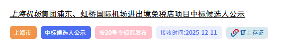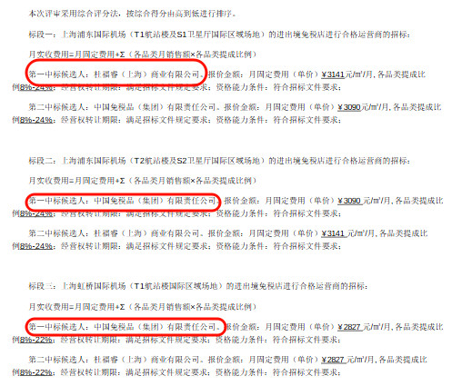 上海机场集团公示了新一轮浦东机场、虹桥机场的免税店招标结果。