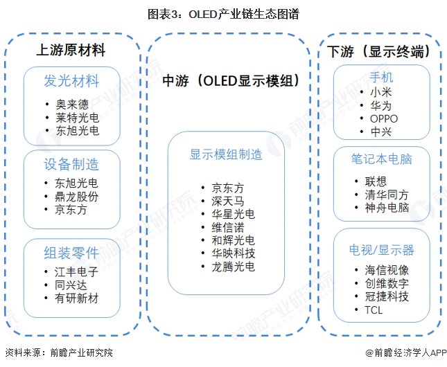 OLED产业链可以划分为相对独立的上游、中游、下游三个部分。OLED产业链的上游包括制造设备、原材料、组装零件的生产制造,中游包括OLED面板制造,下游包括各类终端应用。