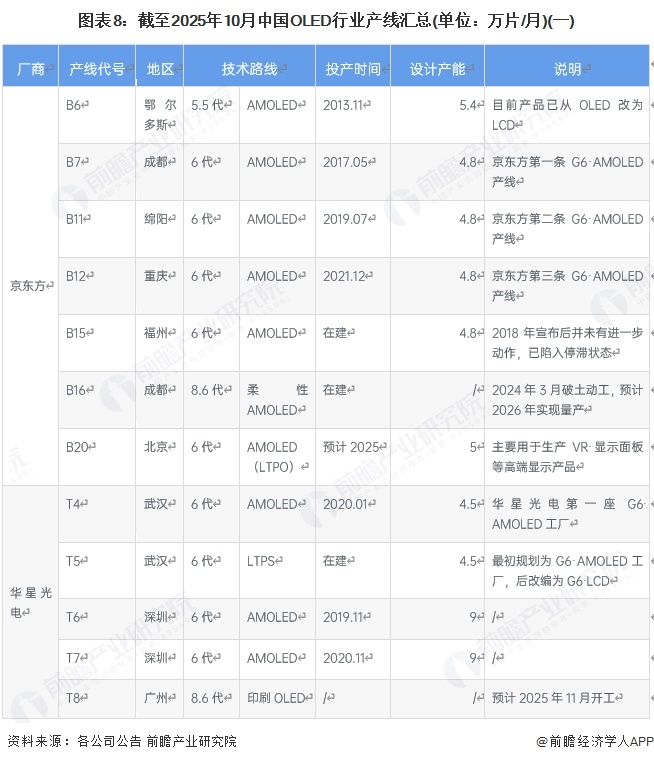 根据各家OLED上市公司披露的OLED产能情况分析。截至2024年底,京东方的OLED投产产能最高,约13.8万片/月。从营业收入情况来看,京东方收入超过1900亿元,排名第一;华星光电为896.68亿元,排名第二。