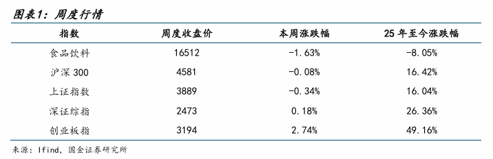 本周(12.18~12.22)食品饮料(申万)指数收于16512点(-1.63%),沪深300指数收于4581点(-0.08%),上证综指收于3889点(-0.34%),深证综指收于2473点(+0.18%),创业板指收于3194点(+2.74%)。