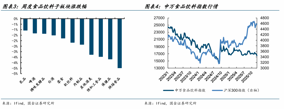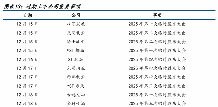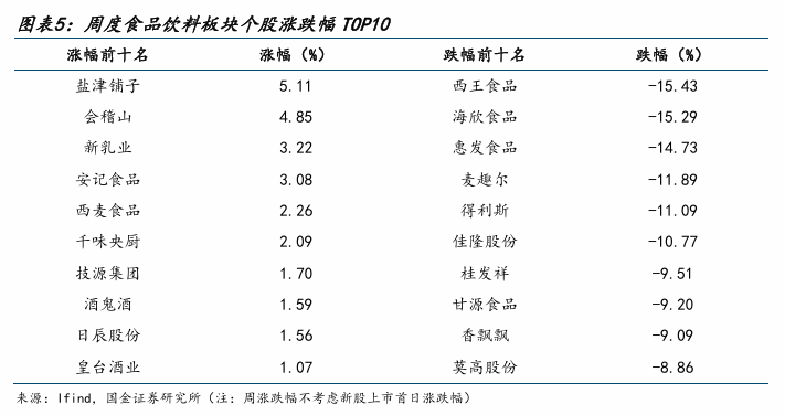 从个股表现来看,周度涨跌幅居前的为:盐津铺子(+5.11%)、会稽山(+4.85%)、新乳业(+3.22%)、安记食品(+3.08%)、西麦食品(+2.26%)等。涨跌幅靠后的为:西王食品(-15.43%)、海欣食品(-15.29%)、惠发食品(维权)(-14.73%)、麦趣尔(-11.89%)、得利斯(-11.09%)等。