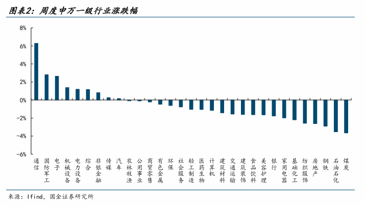 从一级行业涨跌幅来看,周度涨跌幅前三为通信(+6.27%)、国防军工(+2.80%)、电子(+2.63%)。