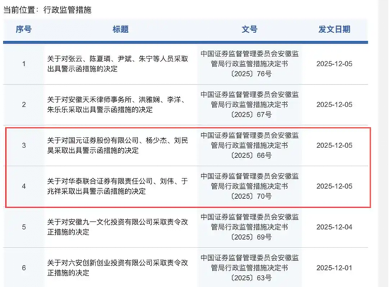 监管层明确,国元证券项目主办人杨少杰、刘民昊,华泰联合证券项目主办人刘伟、于兆祥对违规行为负主要责任。最终,两家券商及上述责任人均被采取出具警示函措施,并记入证券期货市场诚信档案。