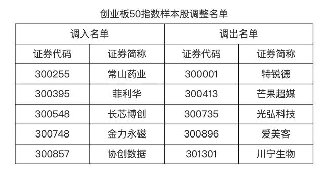 创业板50指数样本股调入常山药业、菲利华、长芯博创等;调出特锐德、芒果超媒、光弘科技等。