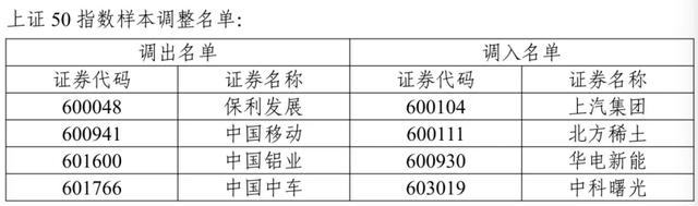 上证50指数本次更换4只样本,调入上汽集团、北方稀土、华电新能和中科曙光,调出保利发展、中国移动、中国铝业和中国中车。