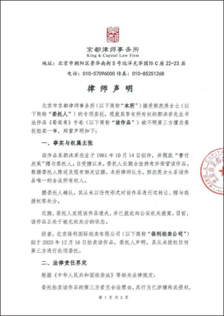 近期,郭沫若《蜀道奇》手卷拍卖引发媒体关注。我公司高度重视郭庶英女士的诉求,一直与其保持积极沟通。公司郑重声明:经核查,该作品的委托⽅申请上拍时确持有该动产,并存有以合理市场价格购入作品的转账记录和购买协议,我司对该拍品的征集、上拍流程均符合拍卖法规定。委托方也于2025年12月14日委托北京乾成律师事务所发出声明。针对该拍品所属权的纠纷,我们愿意积极配合调查,感谢社会各界的关注。