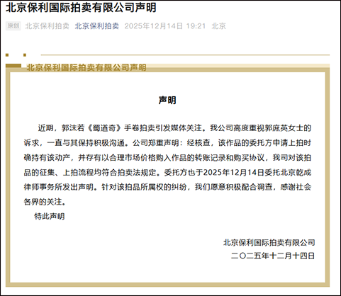 北京保利国际拍卖有限公司微信公众号“北京保利拍卖”12月14日发布声明,全文如下: