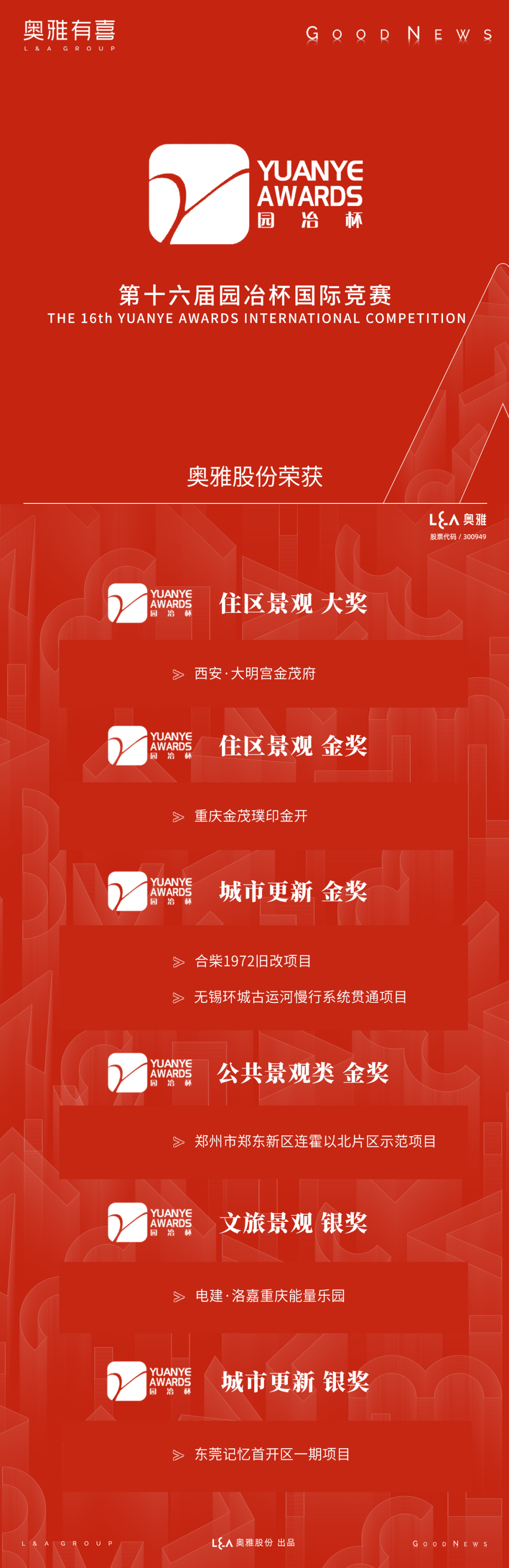 近日,第十六届园冶杯国际竞赛评选结果正式揭晓,奥雅股份(股票代码:300949)凭借多领域精品项目的卓越设计实力,一举斩获七项重磅荣誉,覆盖住区景观、城市更新、文旅景观、公共景观四大核心领域,再次彰显行业领军地位。