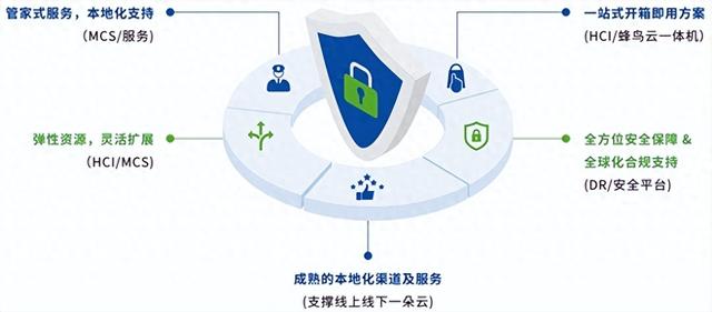 该方案的核心是构建“线上线下一朵云” 的统一架构,实现同架构的私有云与全球布点的本地化混合云服务协同。