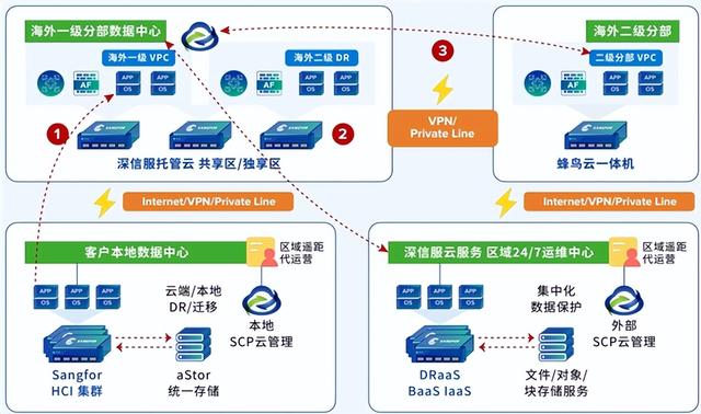 •关键组件:方案图中包含深信服托管云(共享区/独享区)、蜂鸟云一体机、HCI集群、统一存储等,并通过VPN/专线等方式实现互联。