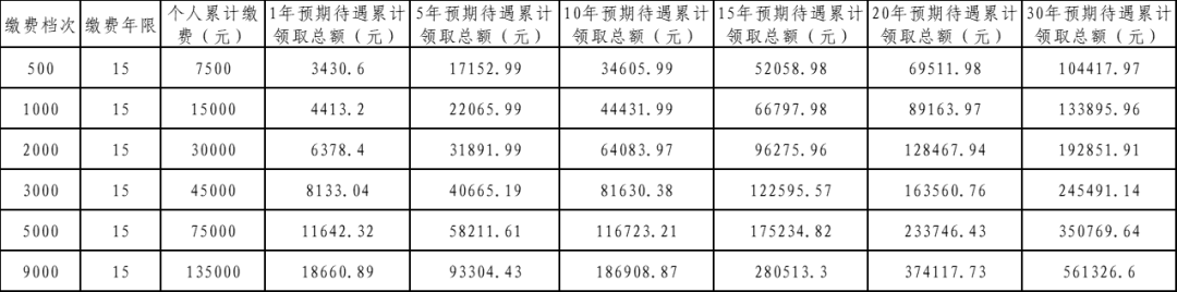 共18个档次,即每人每年200元、300元、400元、500元、600元、700元、800元、900元、1000元、1500元、2000元、3000元、4000元、5000元、6000元、7000元、8000元、9000元。多缴多补,长缴多得,鼓励缴费人选择较高档次标准缴费。