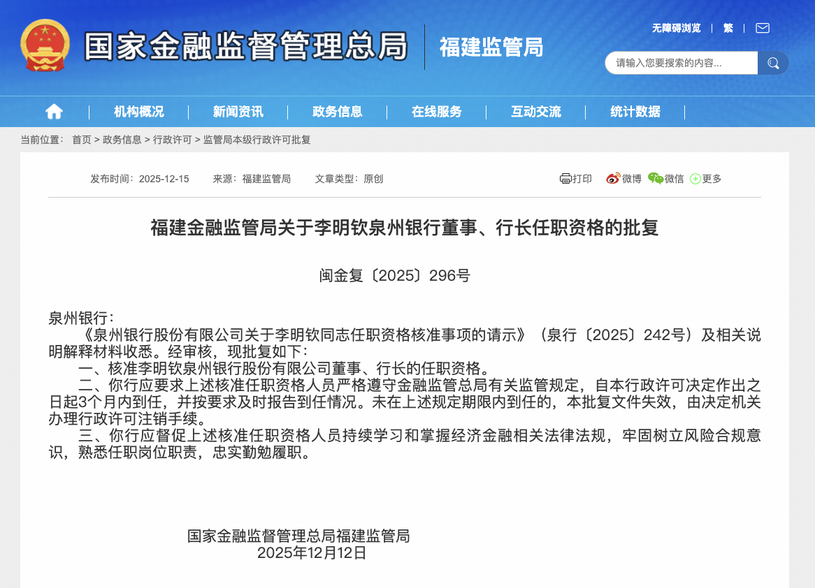 上证报中国证券网讯(记者 黄坤)12月15日,福建金融监管局披露的批复显示,核准李明钦泉州银行股份有限公司董事、行长的任职资格。