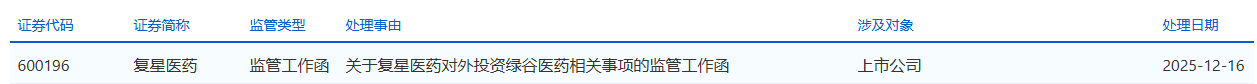 上交所就复星医药对外投资绿谷医药相关事项下发监管工作函