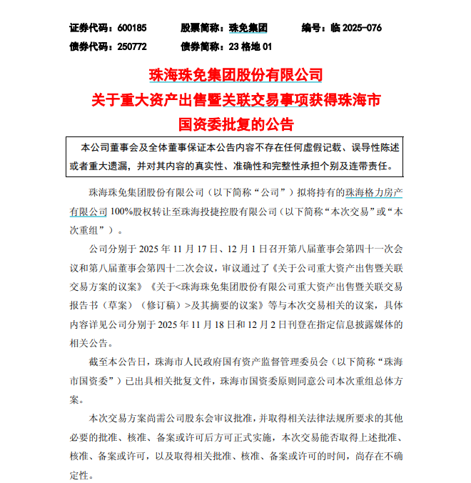 珠免集团(600185.SH)12月15日公告称,公司拟将持有的珠海格力房产有限公司100%股权转让至珠海投捷控股有限公司,本次重大资产出售暨关联交易事项已获得珠海市国资委批复同意。