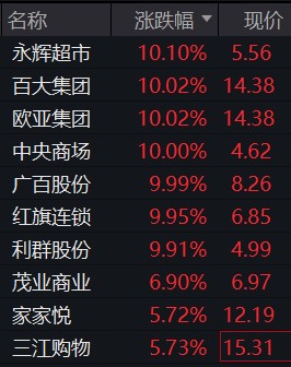 上证报中国证券网讯(记者 于祥明)截至12月16日13点30分,零售消费概念板块持续活跃,红旗连锁、永辉超市、百大集团、中央商场等多股涨停。家家悦、重庆百货、王府井、茂业商业、天虹股份、三江购物等多股跟涨。